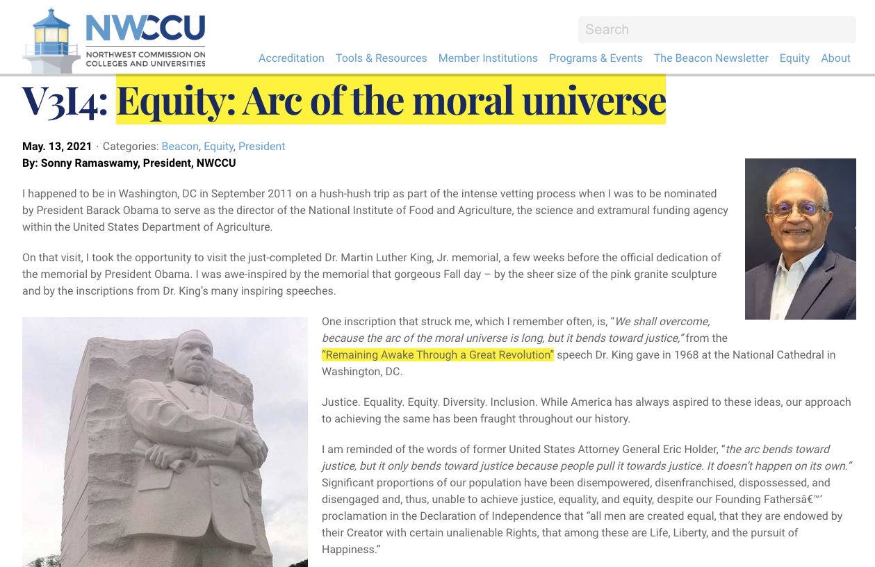 So, just a few months after Gates made his first $2 Million donation, the NWCCU’s president Sonny Ramaswamy wrote an article on their website called Equity: Arc of the moral universe.