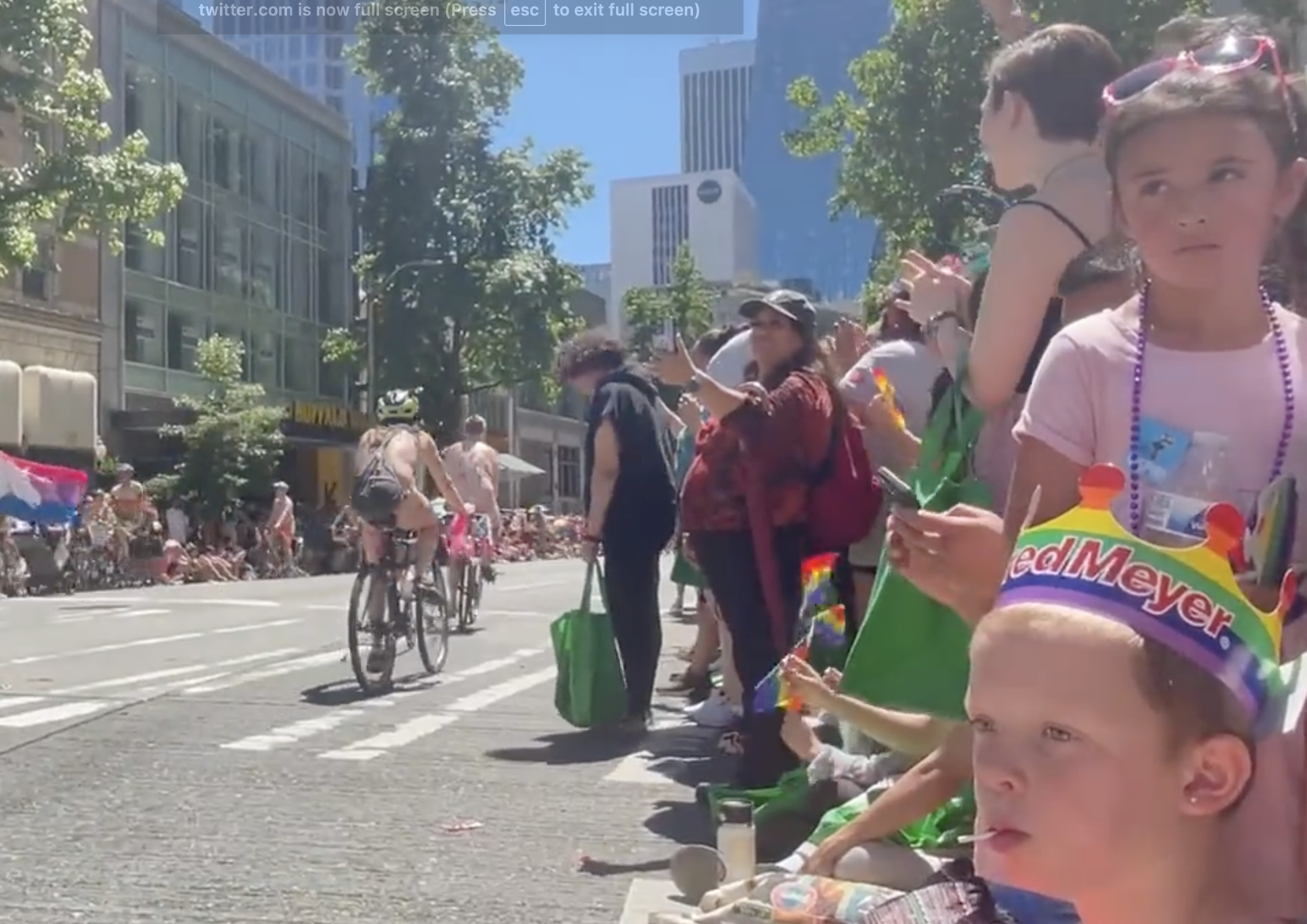 This year’s Seattle gay pride parade featured the Boy Scouts marching alongside completely naked men on bicycles. Young children can be seen in the audience as fully nude adults ride past just feet away.