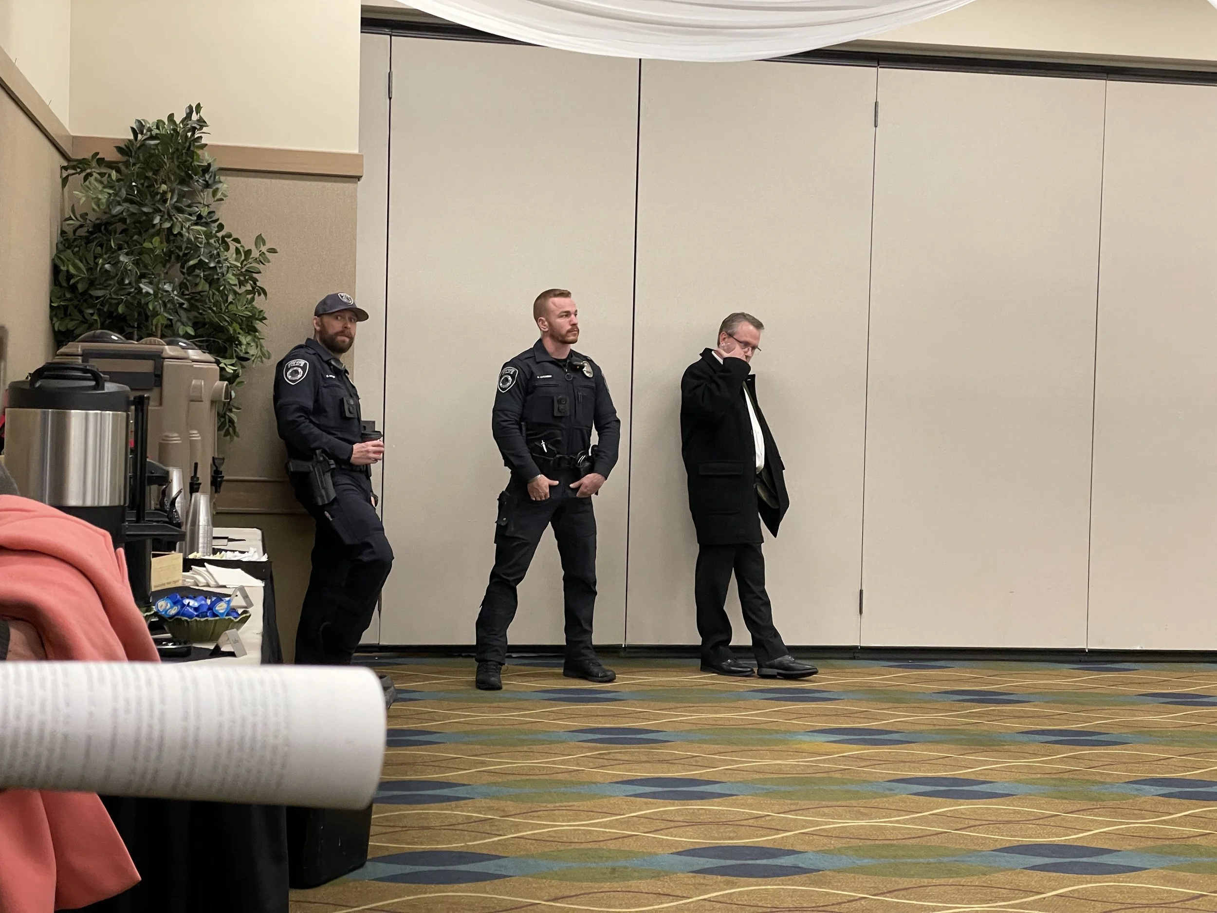 Matheson, the only trustee to attend both public sessions, did not sit with the rest of the trustees, instead, was relegated to the back of the room, surrounded by police.