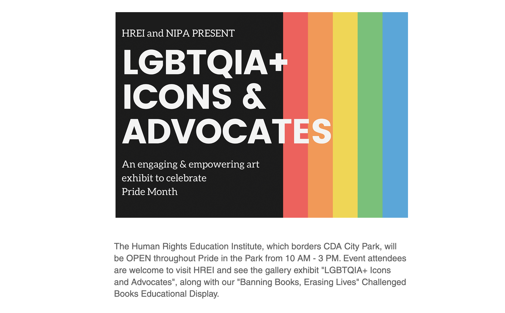 The HREI (Human Rights & Education Centre) is promoting a parallel event in conjunction with North Idaho Pride Alliance which focusses on giving away books that have been banned throughout the country do to the material being viewed as obscene.
