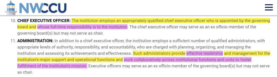 What if Nick Swayne isn't viewed by the NWCCU as effective when dealing with the board? What if they feel he has no idea how to effectively engage the board? What if he doesn't even comprehend NIC policies and his role in implementing them?