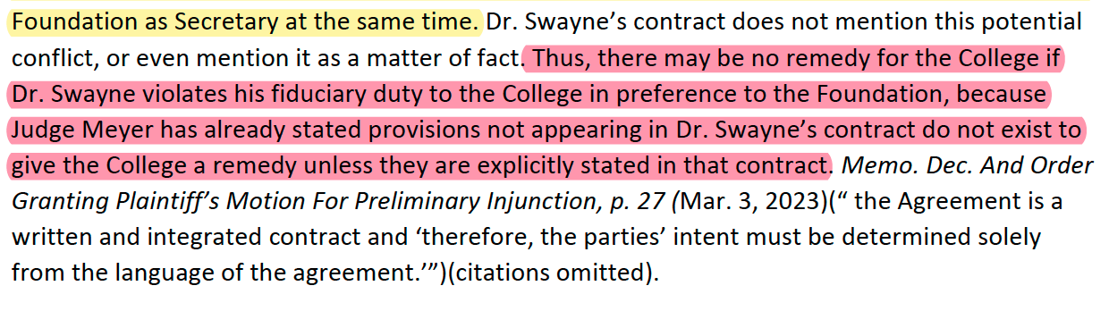 What if there is a conflict of interest between Swaynes duties as the CEO of the college, and as an officer of the NIC Foundation?