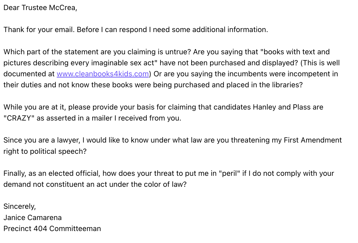 The suit claims that a campaign letter sent by precinct committeewomen Janice Camarena, Anita Dupzyk and Marjorie Desgrosseilliers to their constituents is “defamatory,” however this is going to be a tough allegation to prove. The trustees were not specifically named in the letter, and because they are elected officials, or “public figures” they will have to prove in court that Camarena and the other PC’s acted with malice, intentionally publishing things that they knew were false.