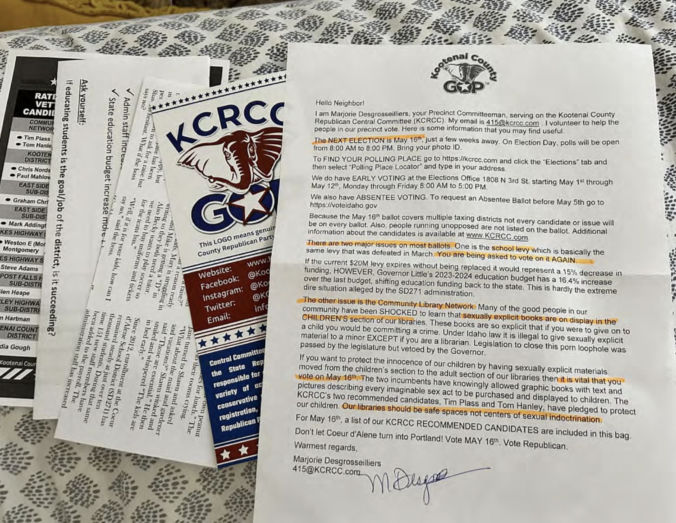 “Many of the good people in our community have been SHOCKED to learn that sexually explicit books are on display in the CHILDREN'S section of our libraries. These books are so explicit that if you were to give them to a child you would be committing a crime. Under Idaho law it is illegal to give sexually explicit material to a minor EXCEPT if you are a librarian. Legislation to close this porn loophole was passed by the legislature but vetoed by the Governor.