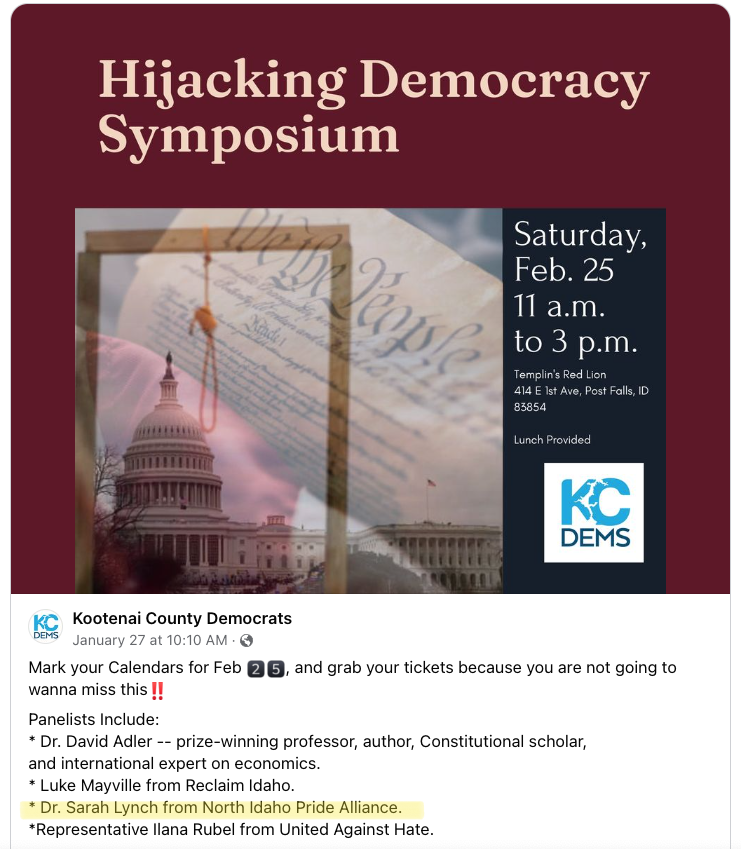 According to the Democrats Website, the event is designed to educate “Kootenai County citizens about the dangers that Marjorie Taylor-Greene and her supporters pose to democracy.”