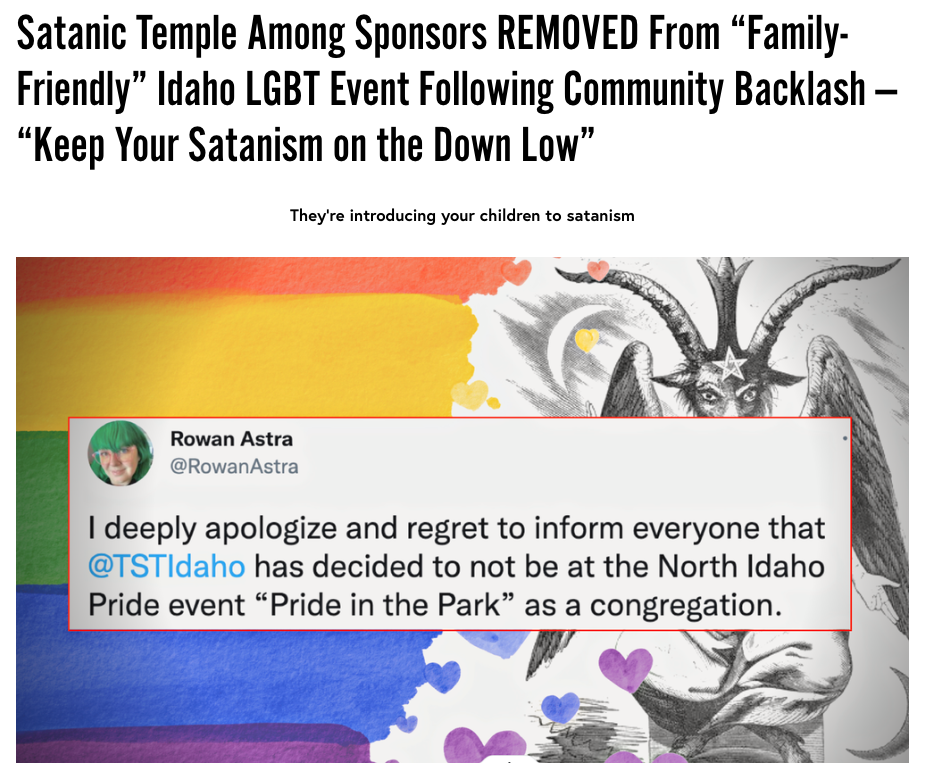 The Rainbow Squad group supported the Predators Pride In The Park debacle, alongside the North Idaho Pride Alliance, Kootenai County Task Force on Human Relations, HREI, Western States Center, Antifa, and The Satanic Temple of Idaho. Although the Satanic Temple backed out of the event (officially) after a public outcry, their representatives urged people to “keep their satanism on the down low.”