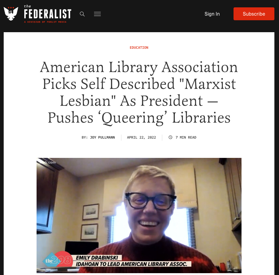 Denise Neujahr will be presented with the 2023 Lemony Snicket Prize for Noble Librarians Faced with Adversity at the American Library Association’s annual conference, where the Idaho’s own Emily Drabinsky, a self-described “Marxist Lesbian” Librarian will become president. Rest assured, Drabinski’s #1 goal is to “Queer the Libraries.”
