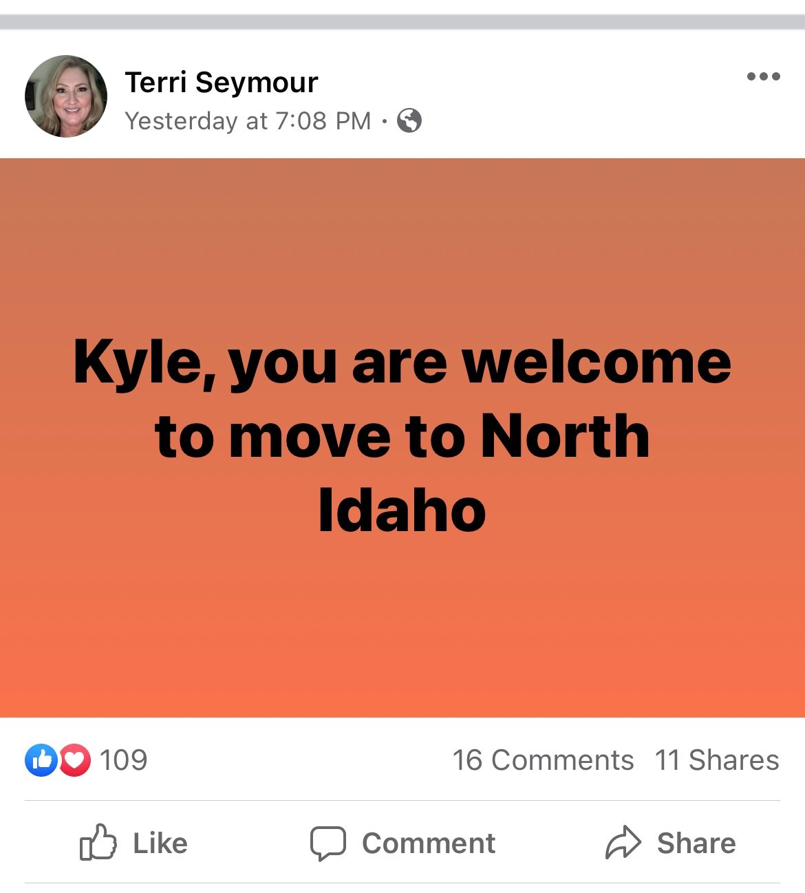 In a post to Facebook, the KCRCC Chair, Brent Regan said that “If Kyle wants a normal life he should move to Kootenai County where he would be among thousands who would bear arms to defend against thugs.”