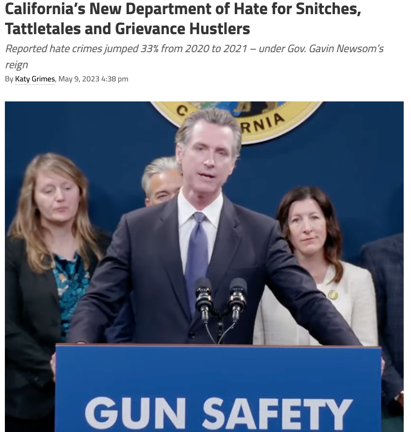 And if you have a problem with any of this? Gavin Newsom has a solution for that too. He’ll just call your grievances “hate speech” and penalize citizens for speaking out.
