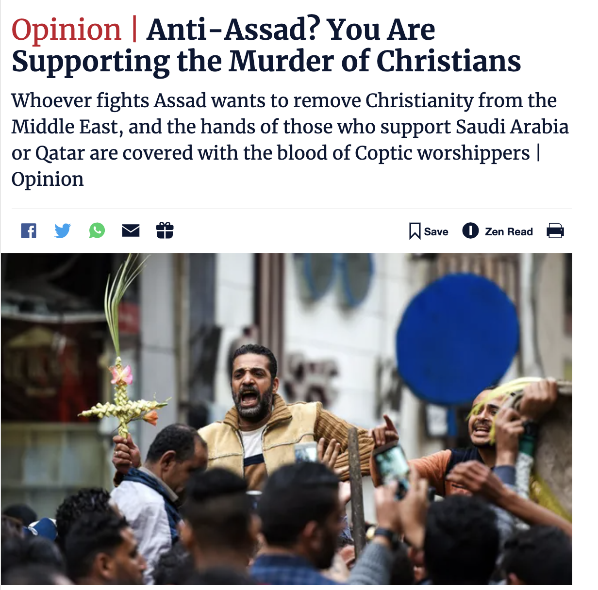 Haaretz Magazine, an Israeli news outlet, published an article in 2017 titled Anti-Assad? You Are Supporting the Murder of Christians. The article went on to say “Whoever fights Assad wants to remove Christianity from the Middle East, and the hands of those who support Saudi Arabia or Qatar are covered with the blood of Coptic worshippers.”