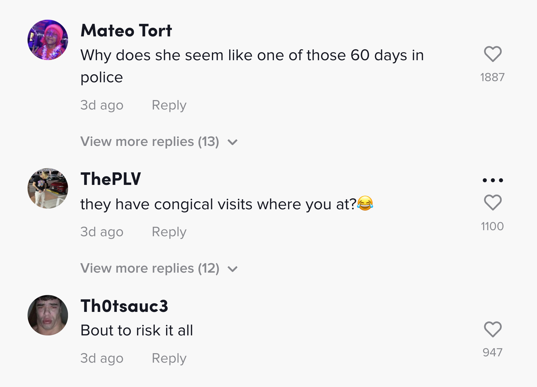 The inmate’s TikTok has reached well over one million views, with many in the comments asking whether the prison allows “conical visits,” with others eluding to “risking it all” and breaking Vanlith out.