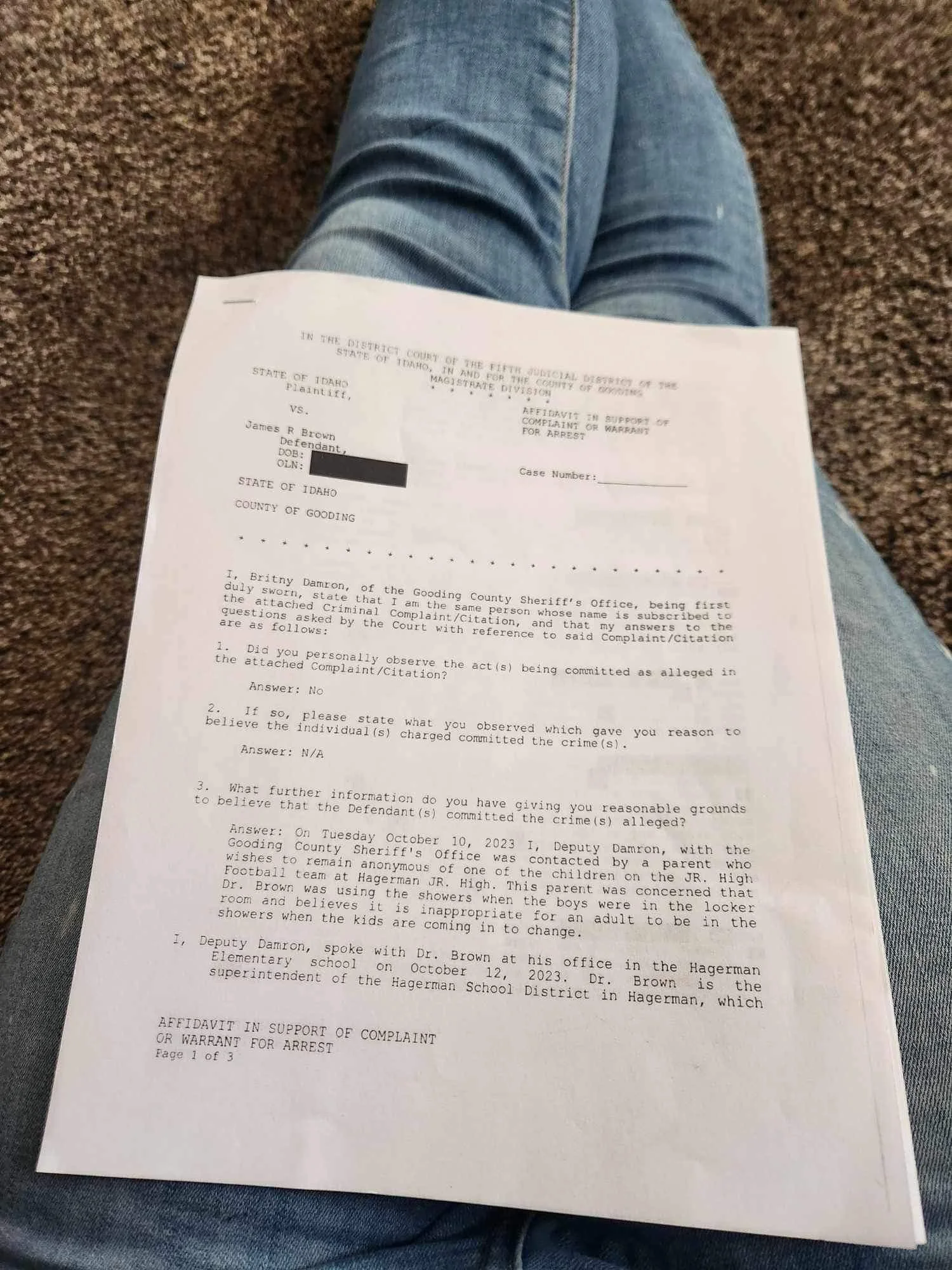 “On Tuesday October 10, 2023 I […] was contacted by a parent who wishes to remain anonymous of one of the children on the JR. High Football team at Hagerman JR. High. This parent was concerned that Dr. Brown was using the showers when the boys were in the locker room and believes it is inappropriate for an adult to be in the showers when the kids are coming in to change.”