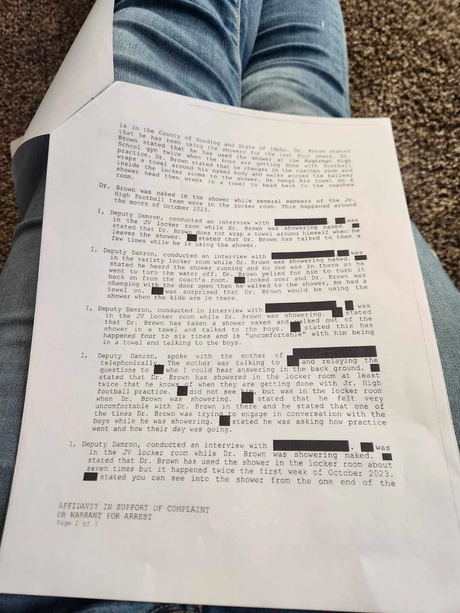 According to a Gooding County Sheriff’s report, “Dr. Brown was naked in the shower while several members of the Jr. High Football team were in the locker room. This happened around the month of October, 2023.”