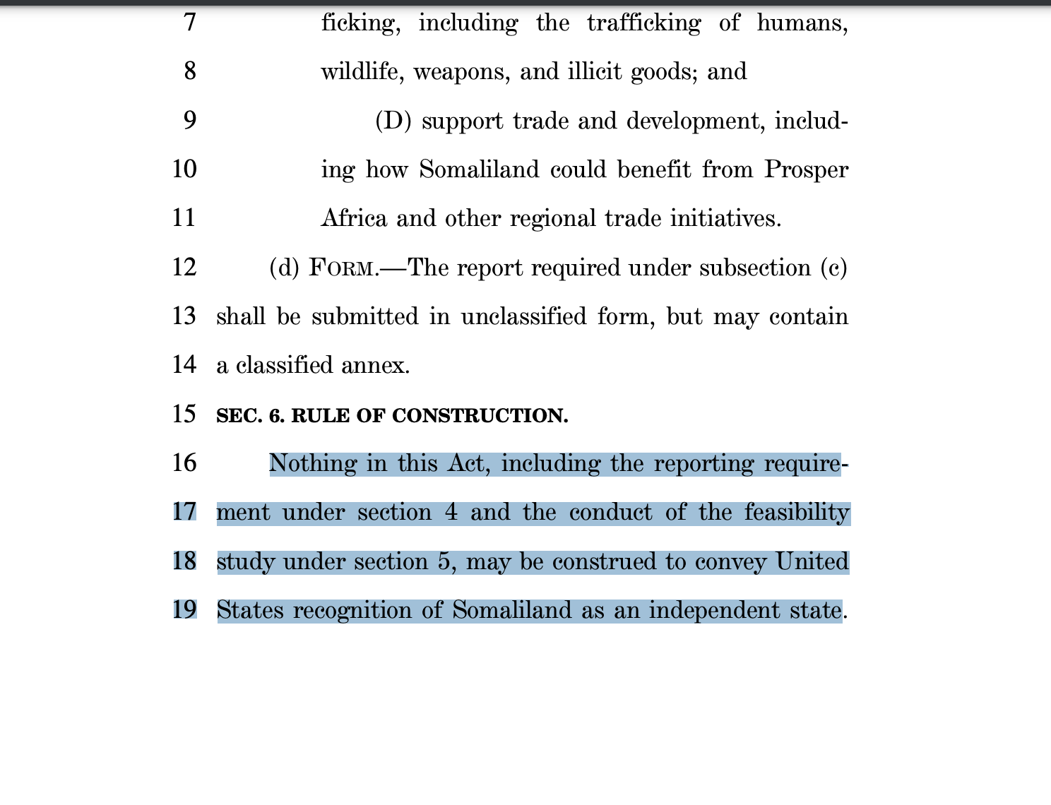 Funnily enough, while the 10 page bill details various efforts, both economically and militarily, to recognize Somaliland as a state-like entity, the bill ends by boldly stating there is “nothing in this act” that could be construed to convey the United States’ “recognition of Somaliland as an independent nation.”