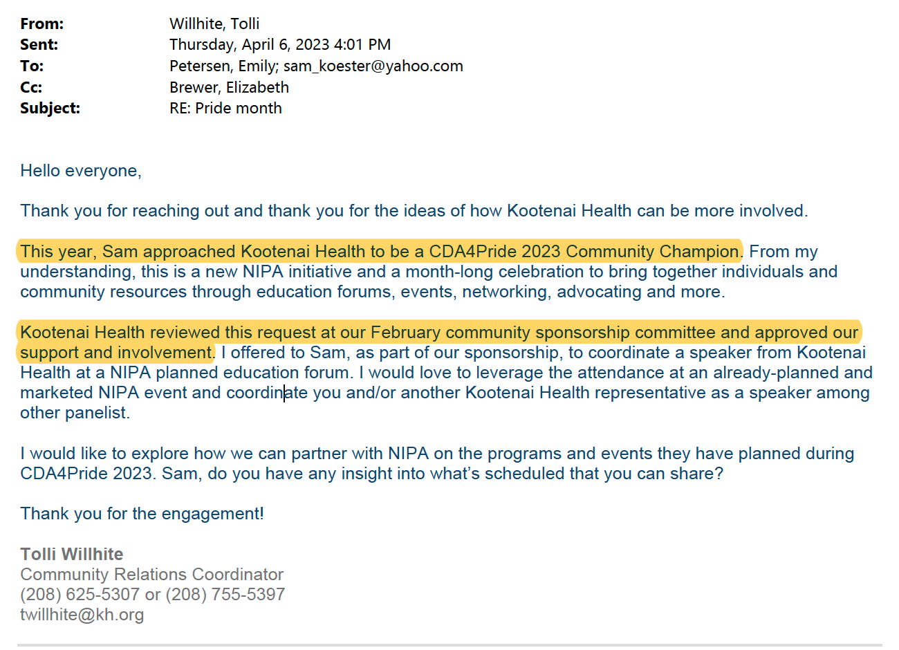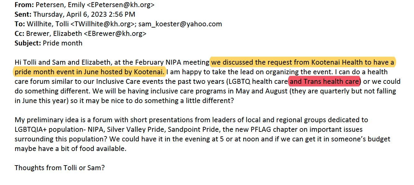 According to the e-mails, a woman who works for Kootenai Health named Emily Petersen, who also appears to also be a member of the North Idaho Pride Alliance, stated that Kootenai Health requested “to have a pride month event in June hosted by Kootenai [Health].