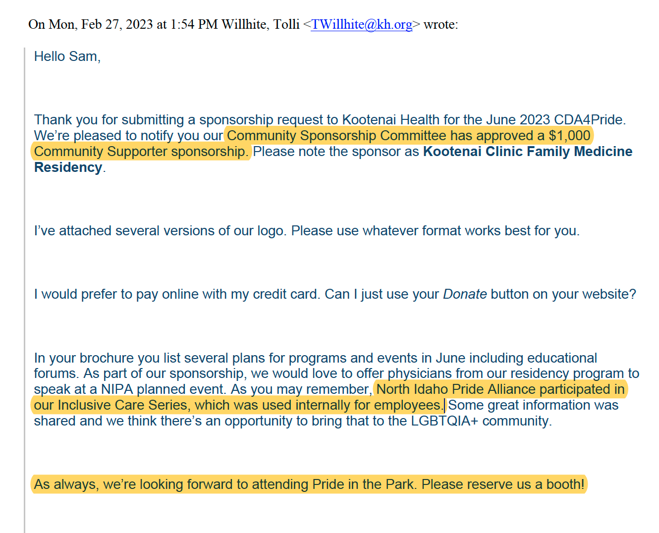 The Kootenai Health’s “Community Sponsorship Committee” approved a $1,000 sponsorship for the pride events.