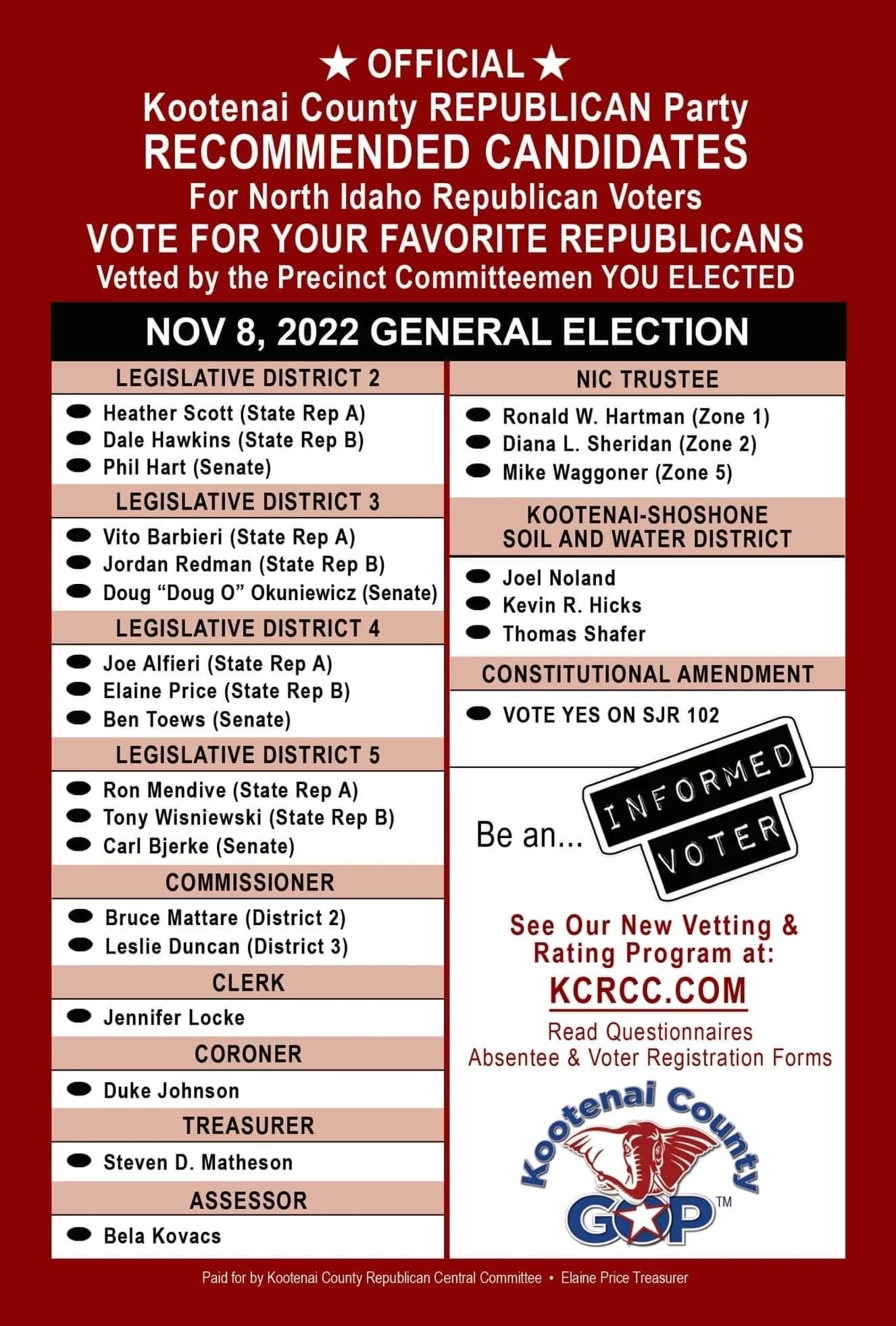 The KCRCC — the official Republican Central Committee in Kootenai County — has published their recommended voter guide for dozens of elections, maintaining a constant format and color school to develop a familiarity with the public, so they recognize what they are looking at.