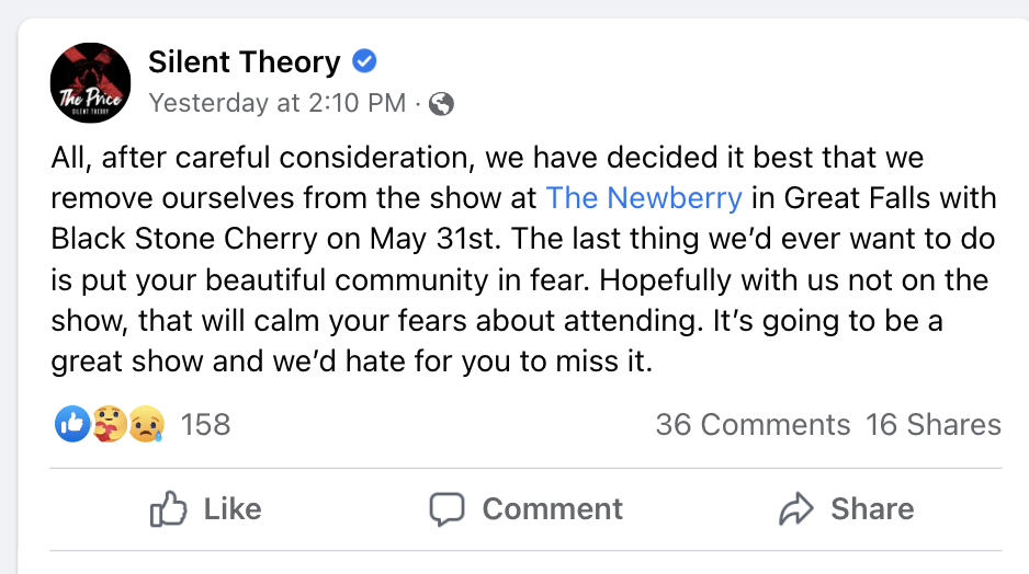 The group, Silent Theory, which was the target of the threatening Facebook posts, has canceled their event as a precautionary measure.