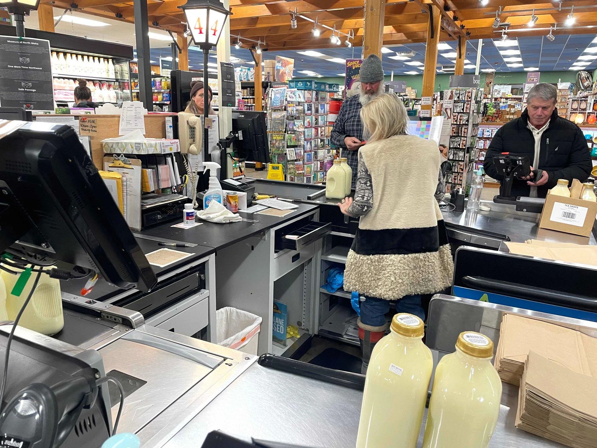 More customers begin to arrive. A mother with 4 children pulls her cart up to the aisle. Another with two children walks up and ask if the raw milk has arrived yet. Customers can be seen visibly frustrated.