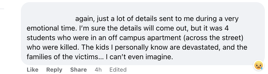 Multiple sources close to individuals involved, are reporting the incident to be a mass-stabbing event involving students at the university. The post reads: “They were all stabbed. Possibly 1 guy, 3 girls from the Greek life.”