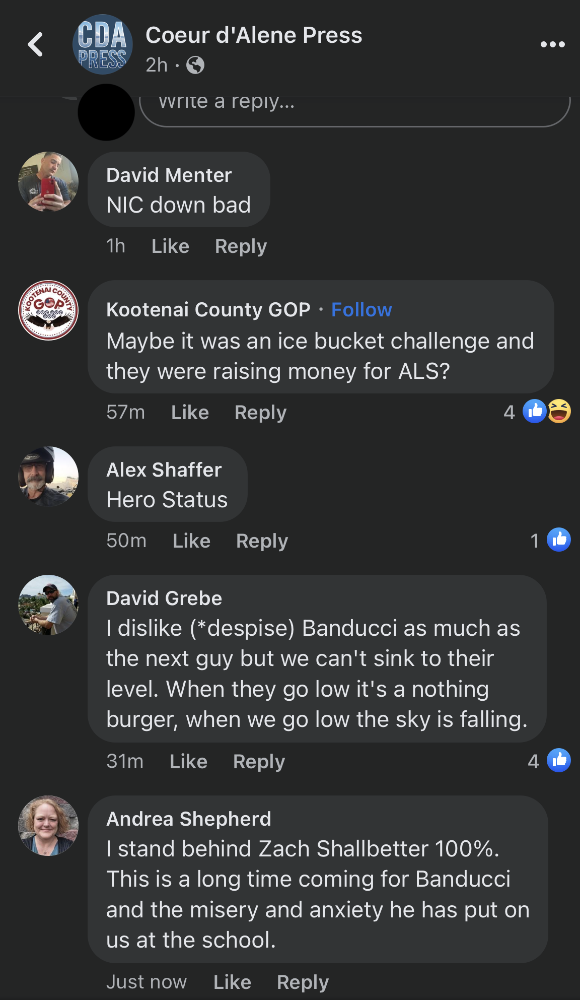 On Facebook, a so-called “satire” account pretending to be the Kootenai County GOP made a sarcastic post saying “This page does not think it is okay to ice bucket challenge anyone. Not even Banducci.”