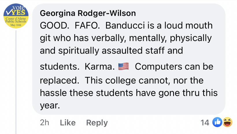 Local leftists have lied about, defamed, slandered, smeared, doxxed and threatened NIC Trustees for well over 3 years now, and during the winter of 2023 the Democrat Party of Kootenai County held a meeting where panelists doxxed Banducci’s business and ratcheted up their violent, dehumanizing rhetoric about the conservative Trustees.