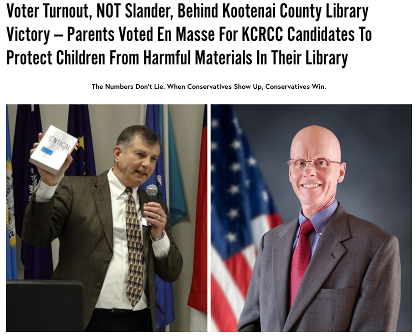 (Kootenai County, Idaho) — Following an intense election season earlier this year in the Spring, conservative KCRCC recommended candidates Tom Hanley and Tim Plass were elected to the Library Board of Trustees.