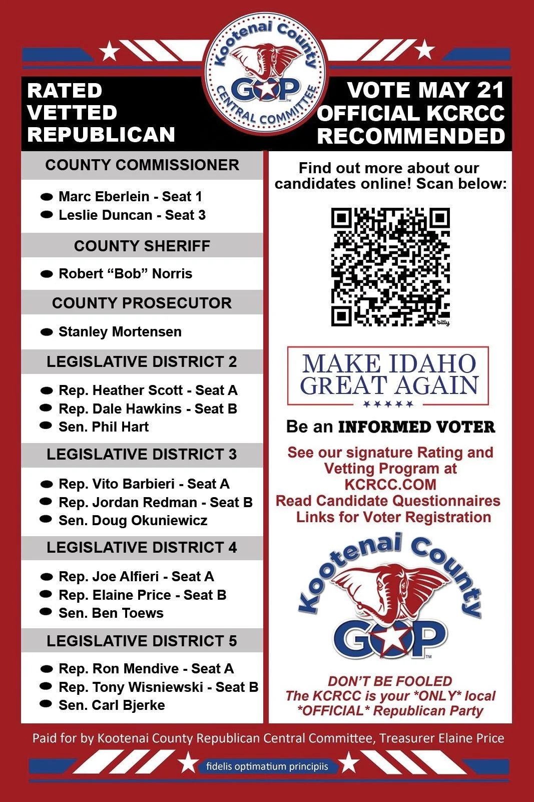The Kootenai County Republican Central Committee’s (KCRCC) 73 unique precinct committeemen from every corner of Kootenai County agree with you that the Republican Party does have an obligation to inform you so you know if what is on the wrapper matches what’s inside.