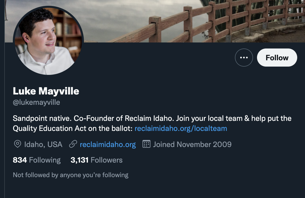 The co-founder of Reclaim Idaho is Luke Mayville. Luke received an extensive liberal education, and is now heavily affiliated with Idaho’s local Democrat organizations.