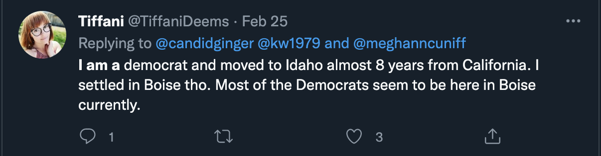 Tiffani is a Democrat who moved to Boise from California 8 years ago. She has since became friends with local Antifa groups online while pushing Reclaim Idaho’s message across the state.