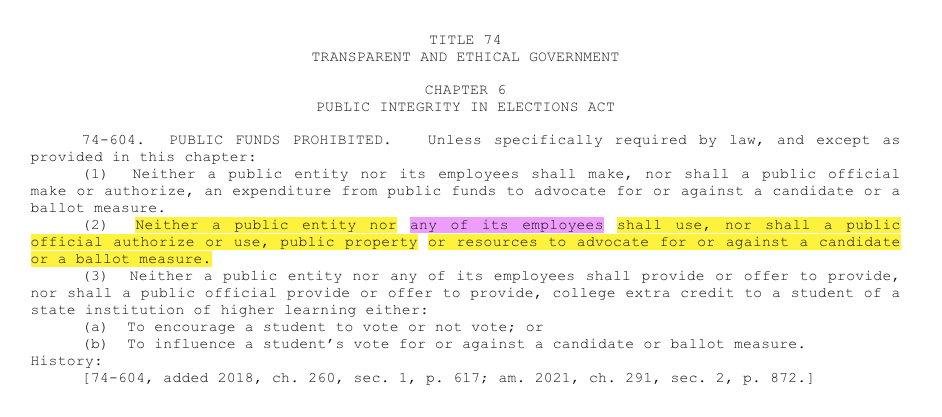According to Idaho Code 74-604, “Neither a public entity nor its employees shall make, nor shall a public official make or authorize, an expenditure from public funds to advocate for or against a candidate or a ballot measure.”
