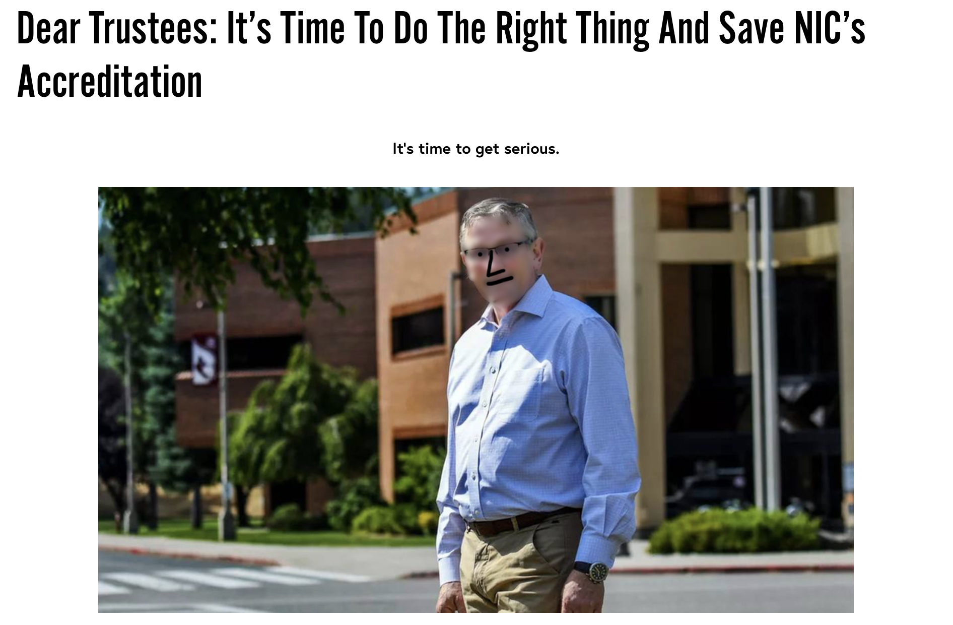 A recent report from the accreditation agency, the North West Commission of Colleges and Universities, slammed President Swaynes “Ineffective Leadership” and even alleged “Conspiracy” and “Unethical Behavior” on the part of the “Save NIC” Trustees.
