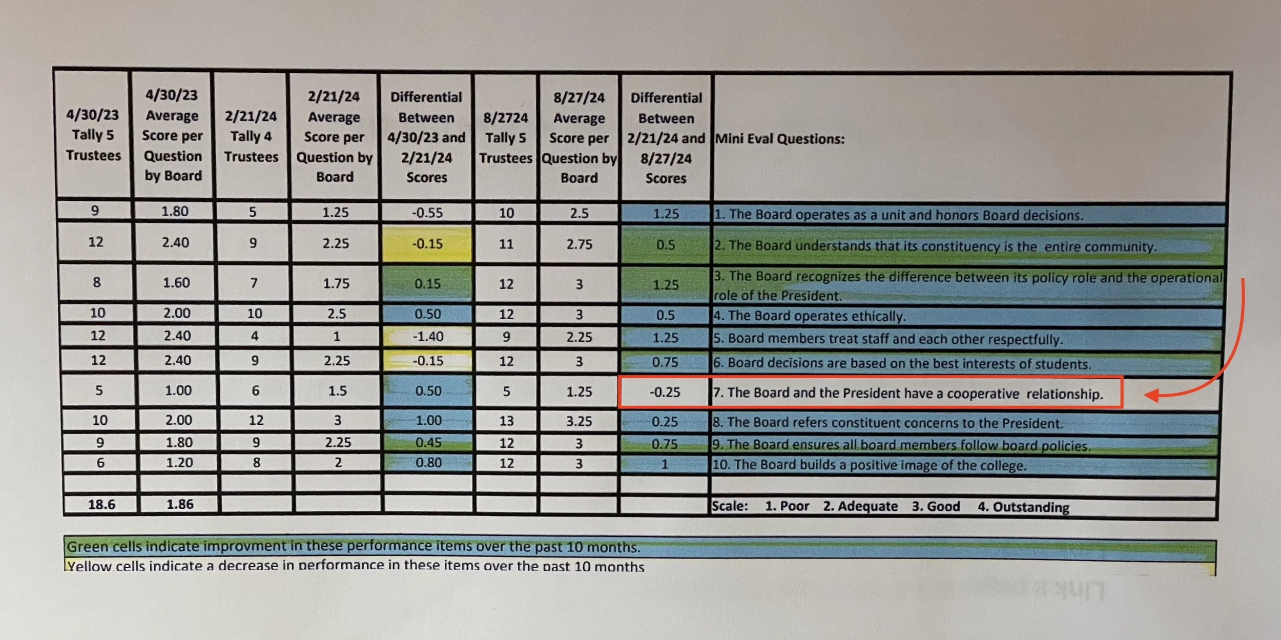 According to new data from the ACCT, an accreditation consulting and compliance agency, the board has been trending in a positive direction, in all categories except one: “The Board and the President have a cooperative relationship.”