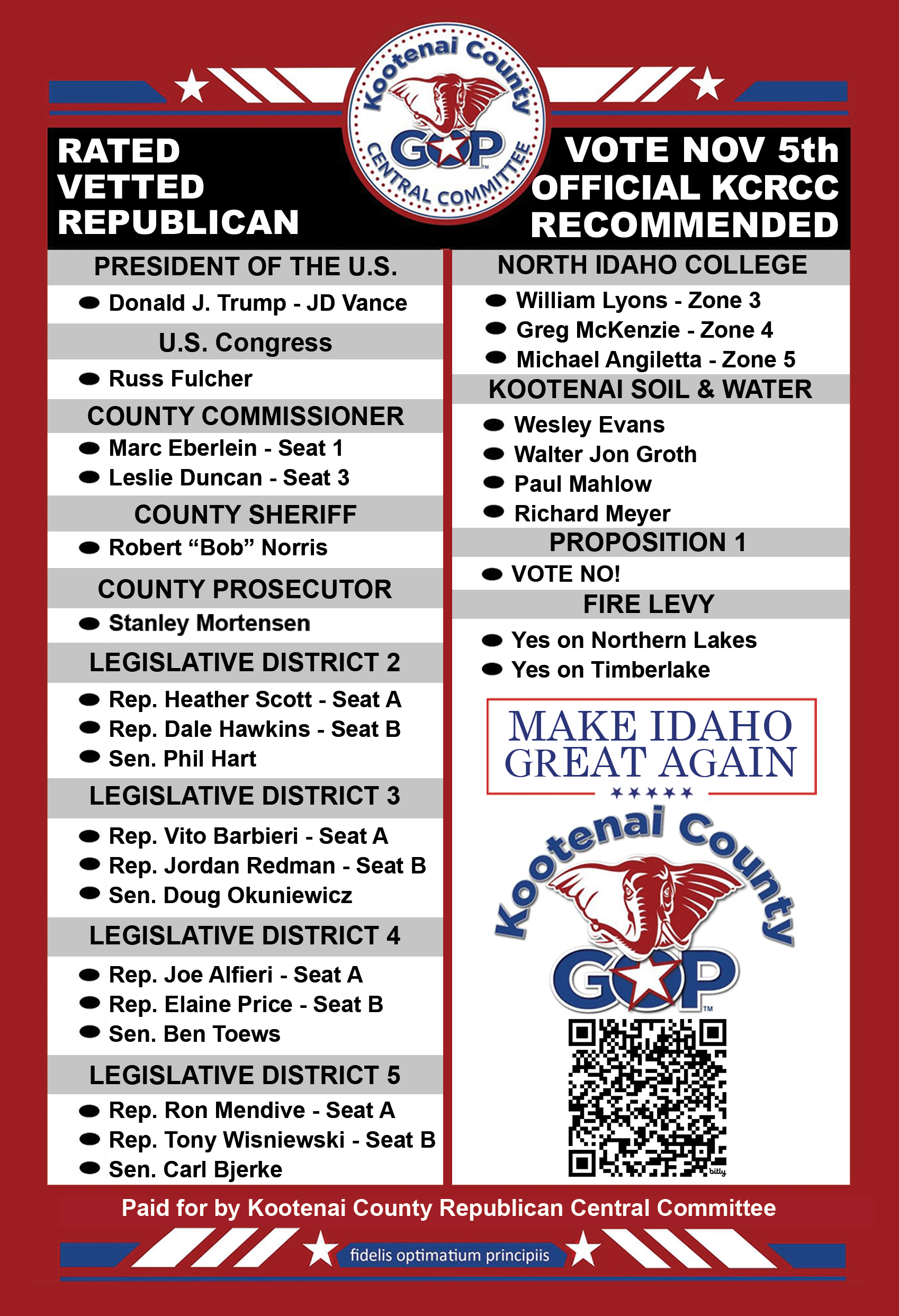 The Kootenai County Republican Party has recommended three candidates for the upcoming November 5th election that will restore the values of Faith, Family and Freedom to the College Board, and Make NIC Great Again!