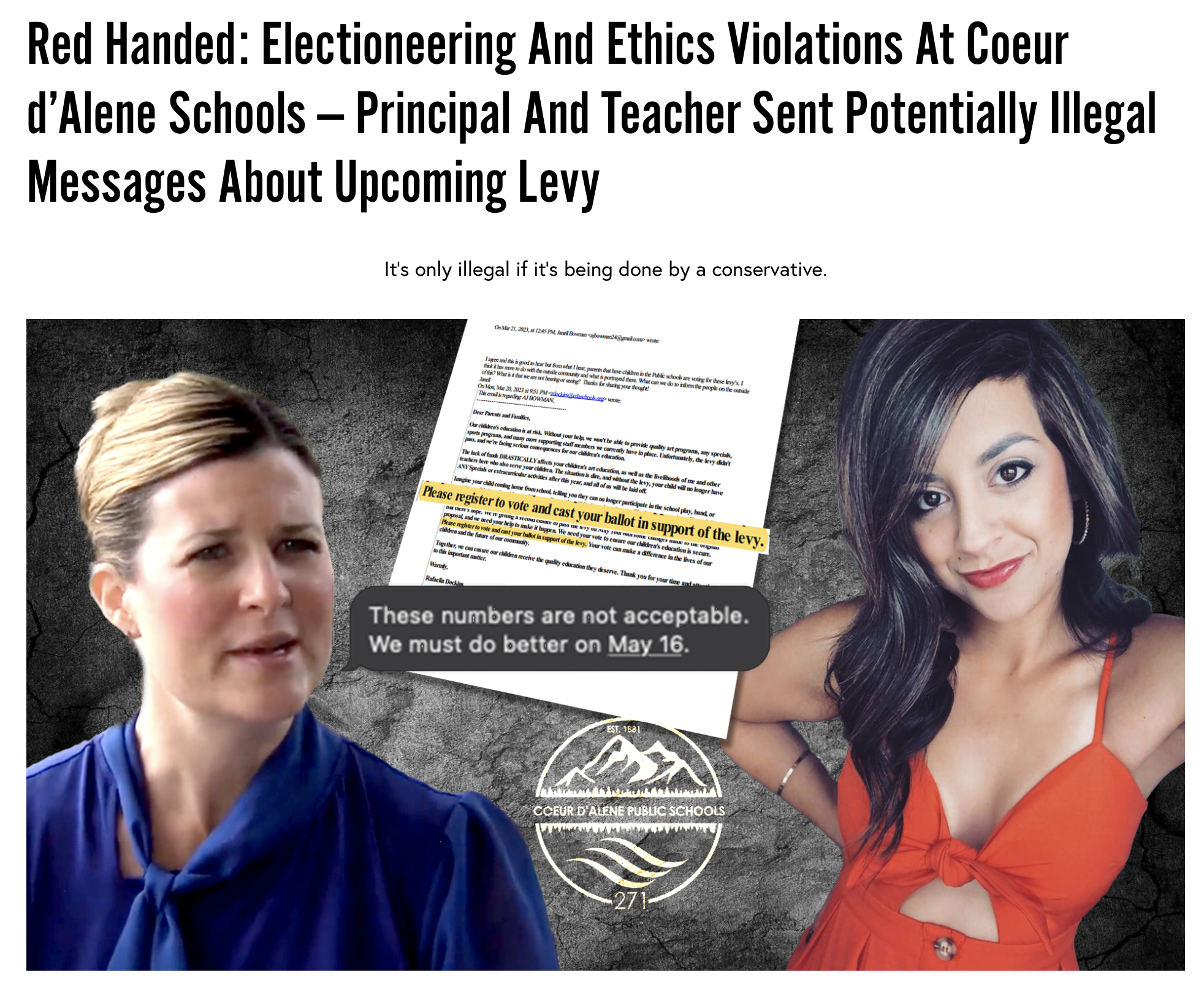 All these things have happened, done by the proponents of the Coeur d’Alene School levy. These people who seem to disregard or be ignorant of Idaho election law are the same ones who want you to give them more money. But it gets worse.
