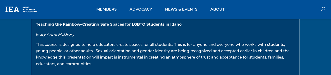 “I’m on your website here, and I’m looking at some of the teaching classes that you offer. […] There was a class and continuing education on your website for ‘Equitable and Just Schools’ and it talks about institutional racism and things of that nature, and then there’s […] ‘Teaching the Rainbow–Creating Safe Spaces for LGBTQ Students in Idaho’ and I just wonder if these are distractions from the core core intent of the Public School system, as to what we’re trying to produce: functional working adults with the intelligence that we’re hoping to achieve from the system.”