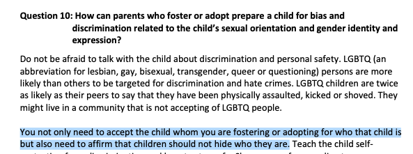 There is a section on “Cultural Humility,” which directs foster parents to “Be the child’s sounding board rather than inserting your own beliefs.”