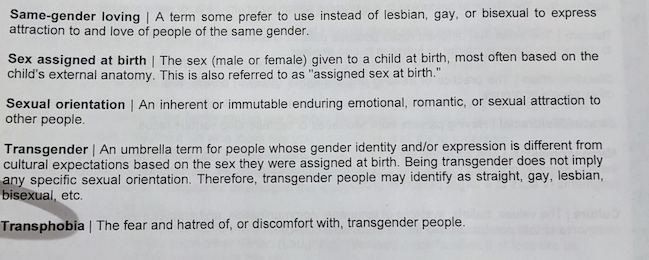 This section goes on to list a glossary of terms such as “Gender non-conforming,” “Genderqueer,” “Gender transition,” “Gender-fluid,” “Non-binary,” “Queer,” “Pansexual,” and many more.