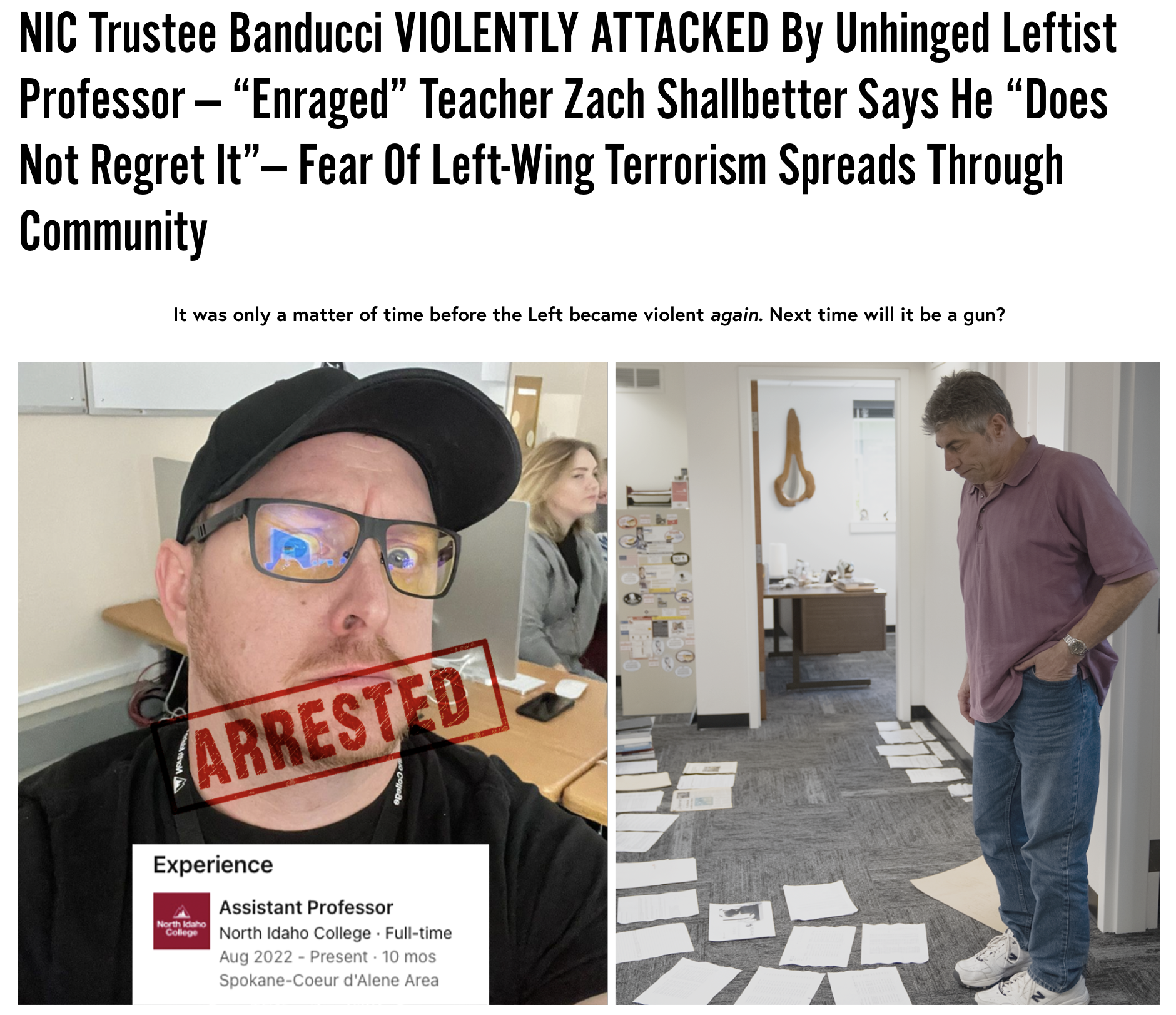 The violent attack, which traumatized not only Banducci’s co-workers, but also his wife, family, but also local conservatives throughout North Idaho, comes after area Democrats held a conference this past winter called “Hijacking Democracy” in which NIC staff, students, fire alarm technicians, former trustees and Coeur d’Alene City Counselors participated in doxxing and dehumanizing rhetoric of the conservative trustees.