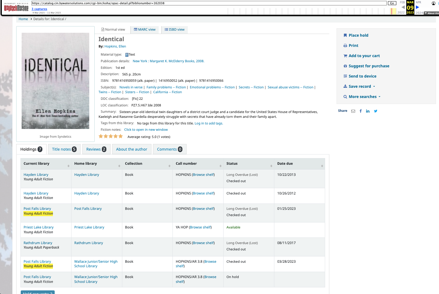 If you go to the Community Library Network’s website today, you’ll see that the only copy available in the system is at the Hayden branch of the library: