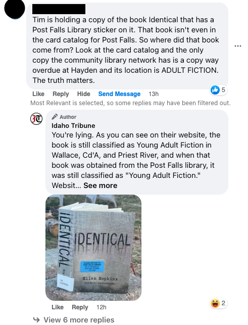 Supporters of the incumbent trustees have been all over social media lying about this book, falsely stating that it was classified “adult” and that “it’s not actually in the Post Falls Library.”