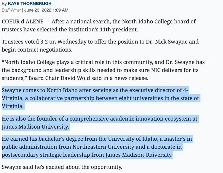 Almost nothing was known about Nick Swayne prior to the board’s decision to hire him to become NIC’s new leader, and the very first time the community-at-large ever heard his name was in an article published on June 23, 2022 by CDA Press “reporter” Kaye Thornbrugh.