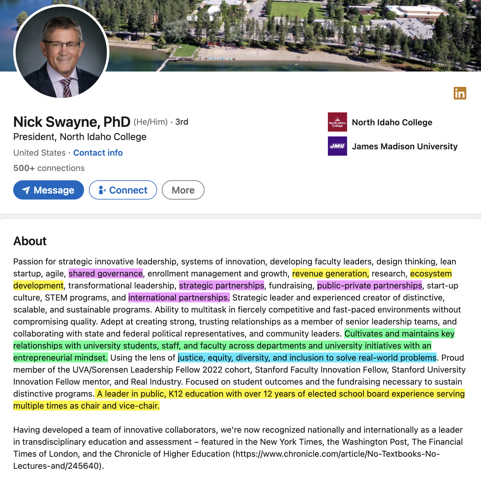 Her husband, the President of North Idaho College, Nick Swayne (He/Him) was also making money off selling masks with Valley Guard Supply, because he served as their Director of Innovation.