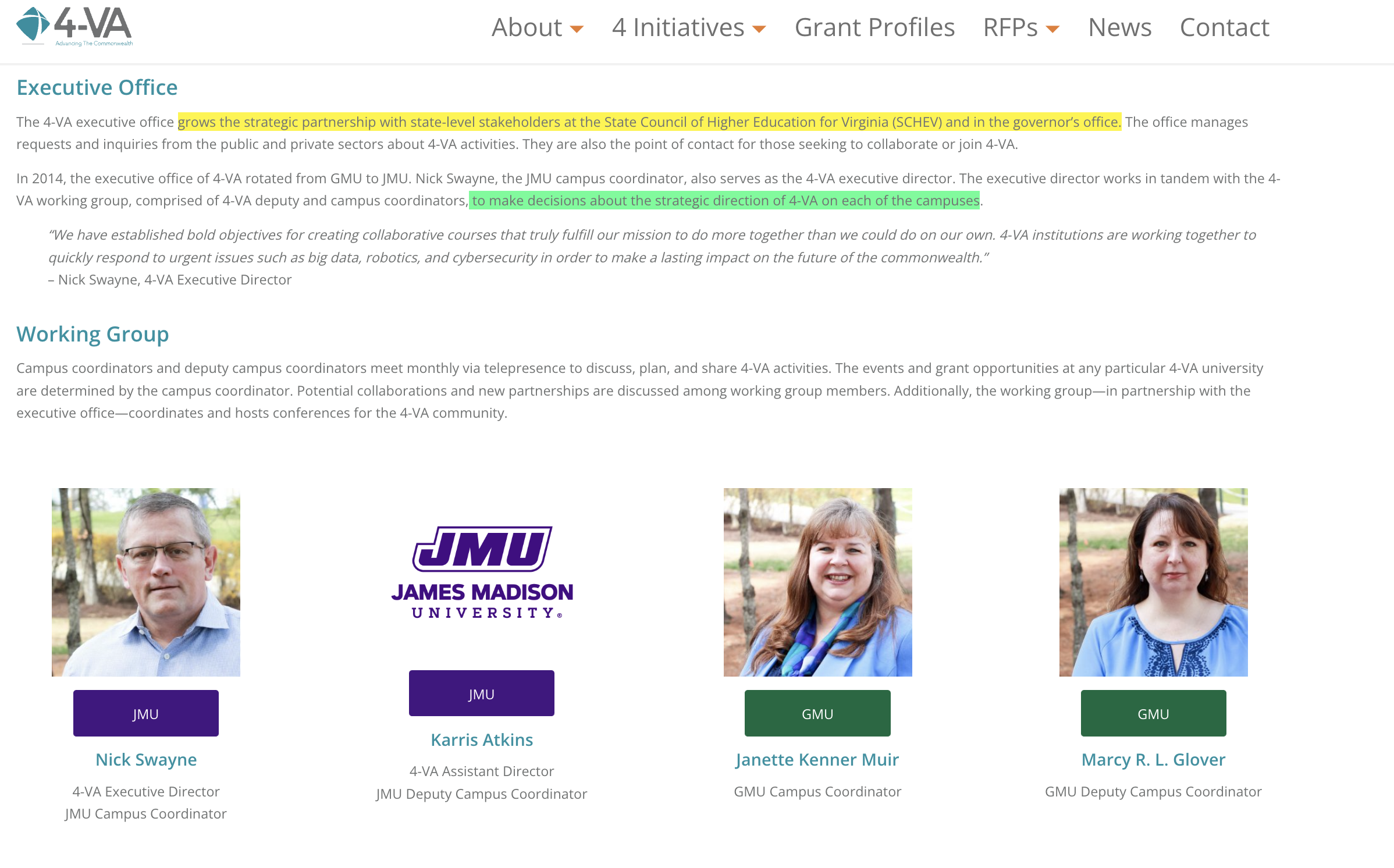 Swayne's job at 4-VA was to grow "the strategic partnership with state-level stakeholders at the State Council of Higher Education for Virginia (SCHEV) and the governors office."
