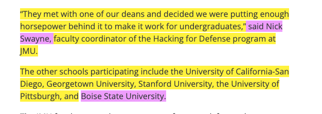 In an article on Meritalk.com titled Pentagon Turns to College Hackers for Battlefield Tech by Morgan Lynch on Feb 24, 2017, it says “James Madison University students are working with the Hacking for Defense (H4D) program, funded by the Department of Defense, in order to build the technologies that the military needs in current situations.” The article says: