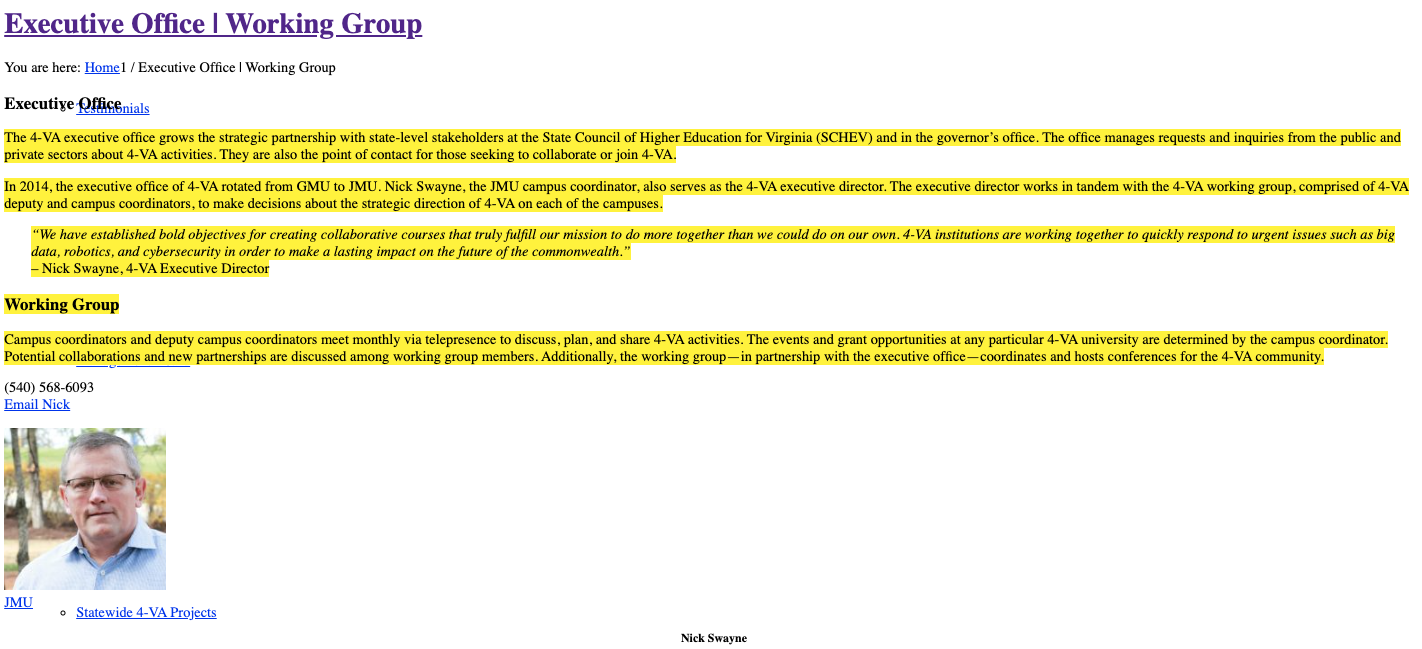His work at JMU X-Labs was fairly minimized, and nothing was mentioned of all the critical things he did with the State Council of Higher Education of Virginia "growing the partnership" with the governor.
