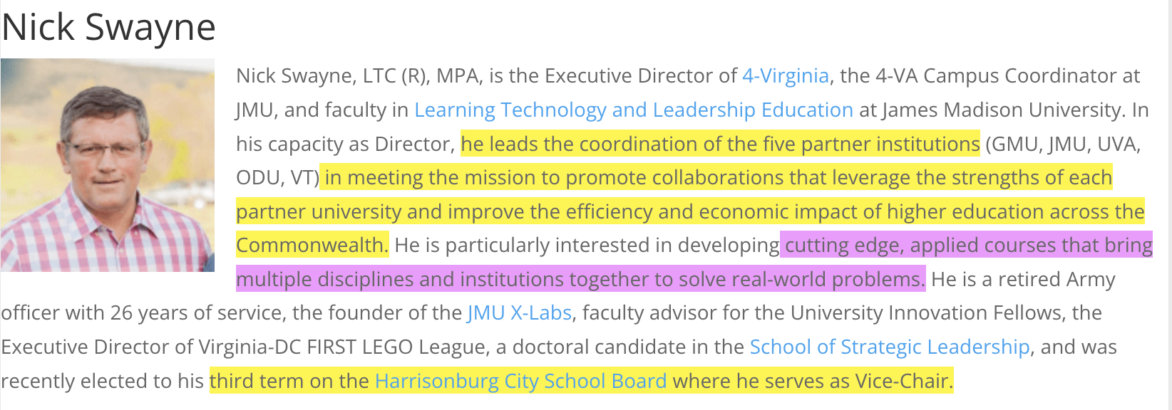 And of course yet another bio from the 4-VA.com, private consortium between James Madison University, where Swayne’s “X-Labs” was based, and 7 other Virginia Universitites. A group Swayne served as Executive Director of between 2014-2021 when he moved to Idaho.